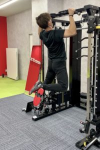 写真のように脚を後ろで組み股関節を伸展・骨盤を前傾させて懸垂を行うことで、特に下背部の筋肉の強い収縮を感じることができます。